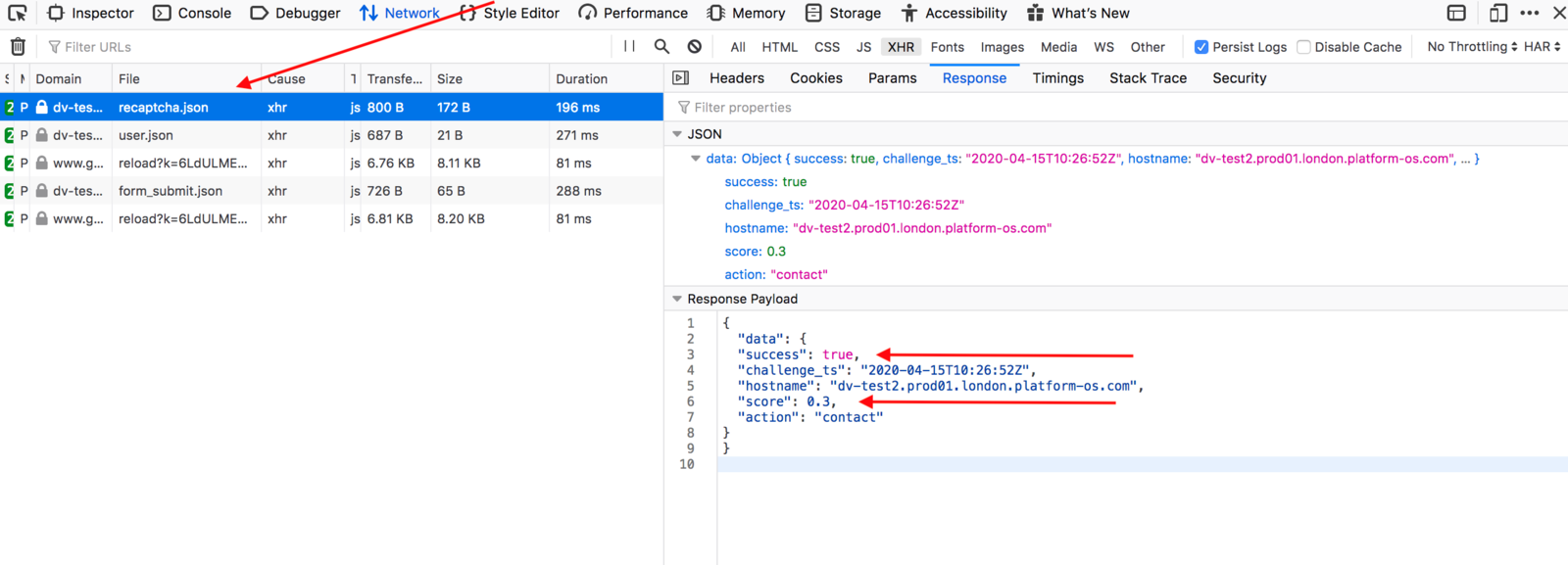Click the recaptcha.json request file to open up a pane to the right with a 'Response' tab.